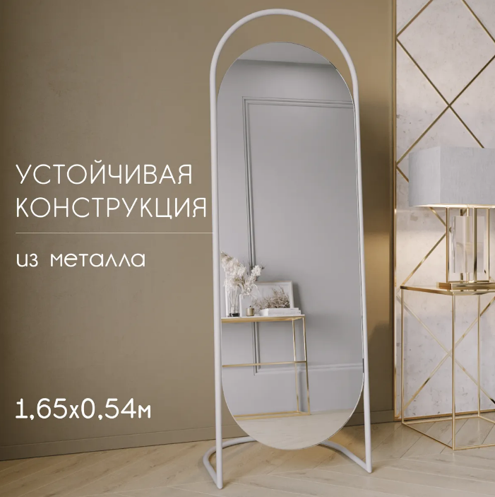 Зеркало «Queen». Артикул GMZ-01-1/2/3 Дизайнерское напольное зеркало в полный рост в металлической овальной раме ручной работы выполнено в минималистичном стиле. Простая изысканность форм и современный дизайн делает его уместным практически в любом интерьере. Оно может быть установлено в спальне, прихожей, гостиной, где за счёт своих внушительных размеров способно расширить пространство и создать иллюзию источника освещения. Зеркальное полотно изготовлено известным бельгийским производителем AGC и воплощает в себе старинные европейские традиции в совокупности с новейшими технологиями изготовления стекла. Наклон зеркала оптимальный фиксированный, что позволяет отражать любой рост.Характеристики:– профиль рамы – труба, диаметром 20 мм; – габариты – 1650х540х400 мм; – размер зеркального полотна – 1350х500 мм, толщина – 4 мм; – вес – 11 кг; – устойчивая двухслойная порошковая окраска; – возможные цвета – золотой, чёрный, белый.